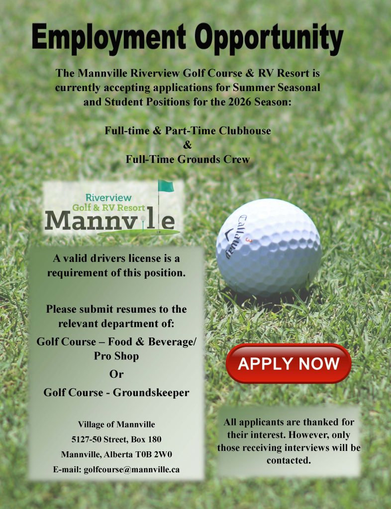 The Mannville Riverview Golf Course & RV Resort is currently accepting applications for Summer Seasonal and Student Positions for the 2026 Season: