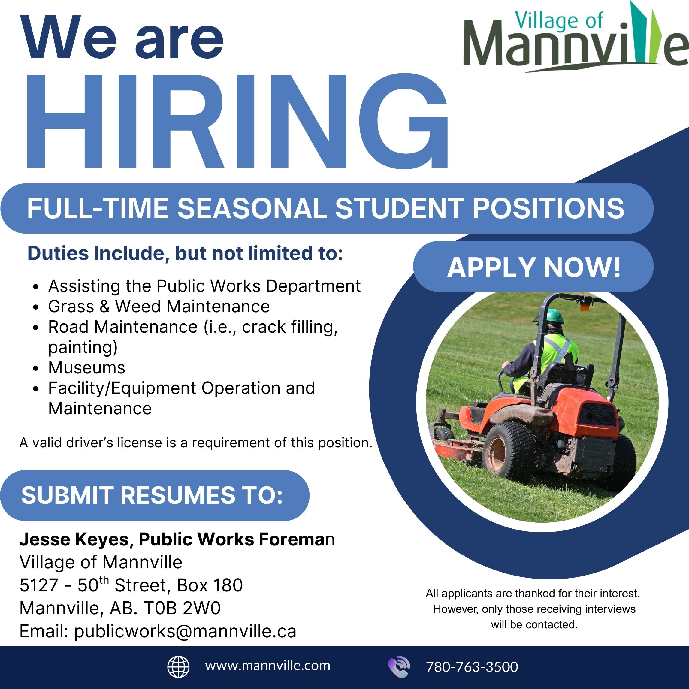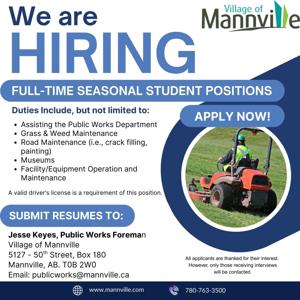 The Village of Mannville is currently accepting applications for