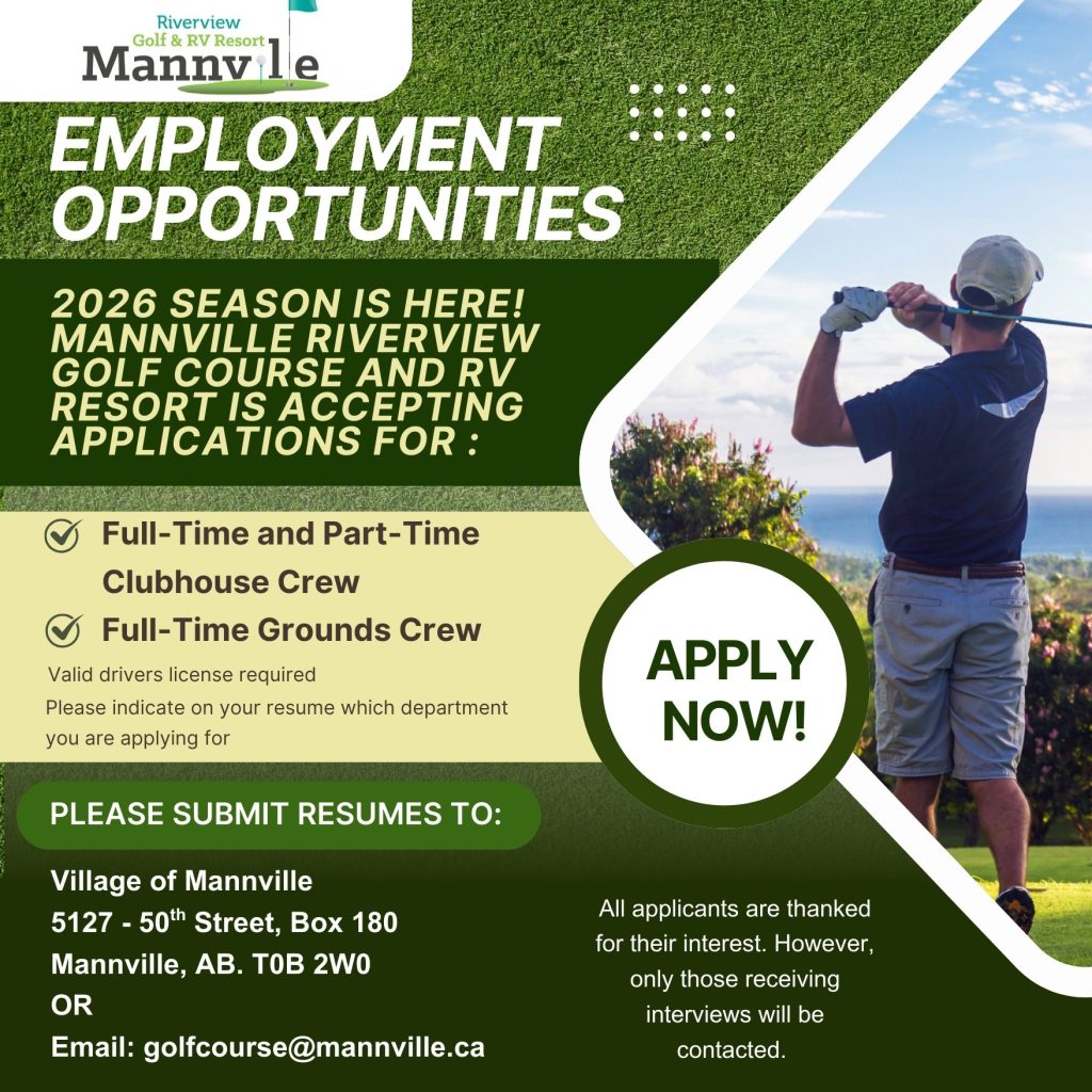 The Mannville Riverview Golf Course & RV Resort is currently accepting applications for Summer Seasonal and Student Positions for the 2026 Season:
