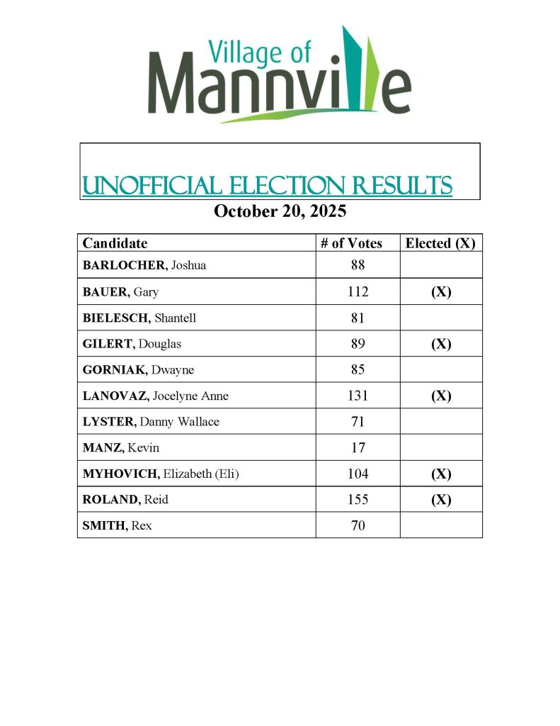 If you have any questions regarding the upcoming election, please contact the Returning Officer for the Village of Mannville at 780-763-3500 or via email: cao@mannville.com.