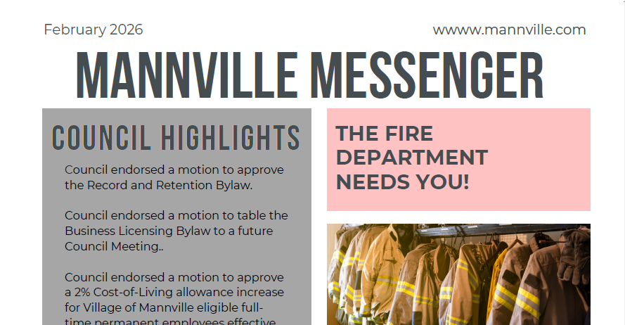 Please see the Village of Mannville’s social media sites for news and updates from the Village.