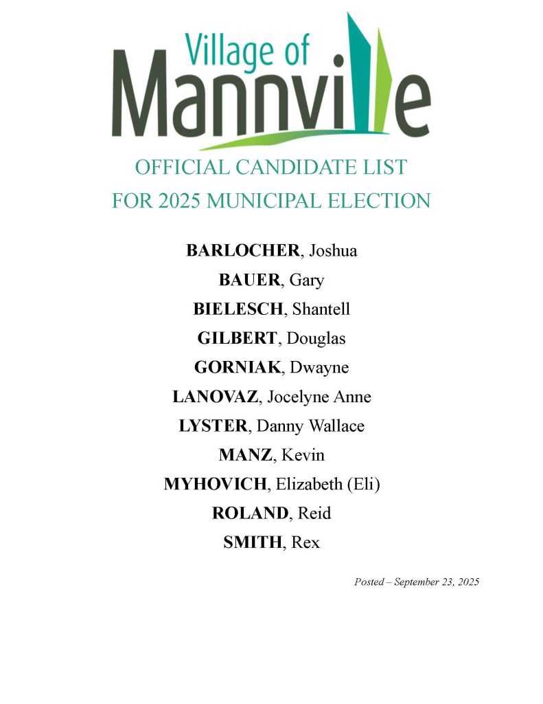 If you have any questions regarding the upcoming election, please contact the Returning Officer for the Village of Mannville at 780-763-3500 or via email: cao@mannville.com.