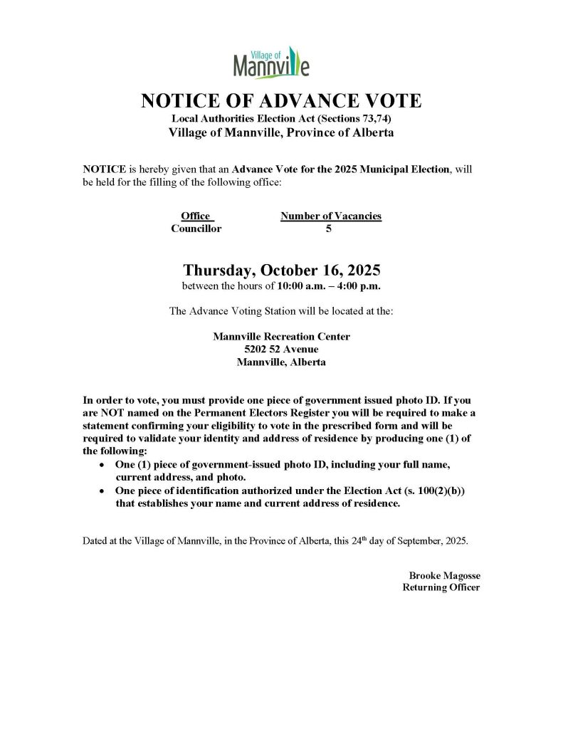 Notice is hereby given that Nomination Day is September 22, 2025 and that nominations for the election of five (5) Councillors will be recevied at the Village of Mannville Administration Office (5127-50 Street, Mannville Alberta T0B 2W0) within the period beginning on January 1, 2025 and ending at 12:00 noon on Nomination Day (September 22, 2025).