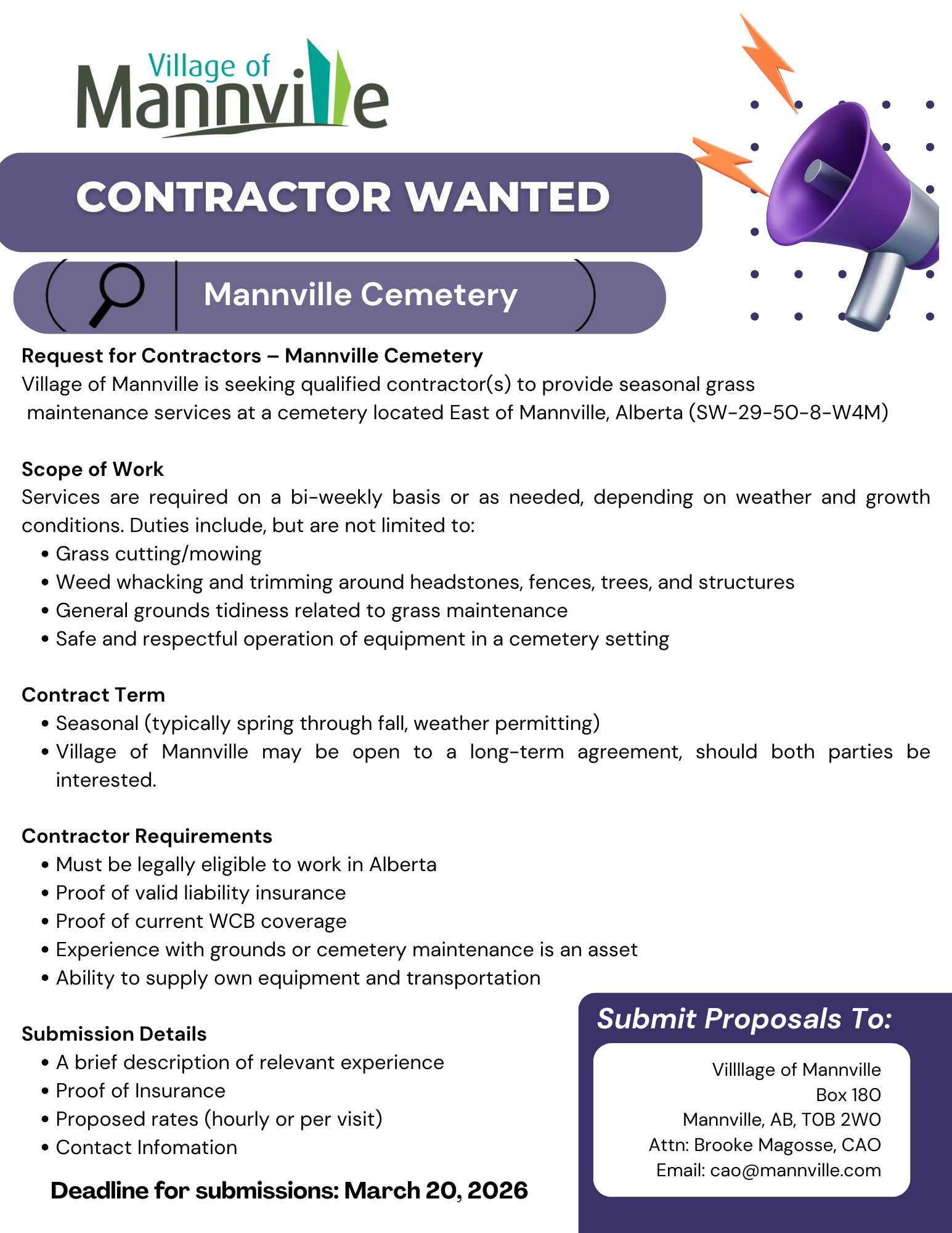 | Contractor – Mannville Cemetery Grass Maintenance | January 20, 2026 | March 20, 2026 | n/a | AD – Click HERE |